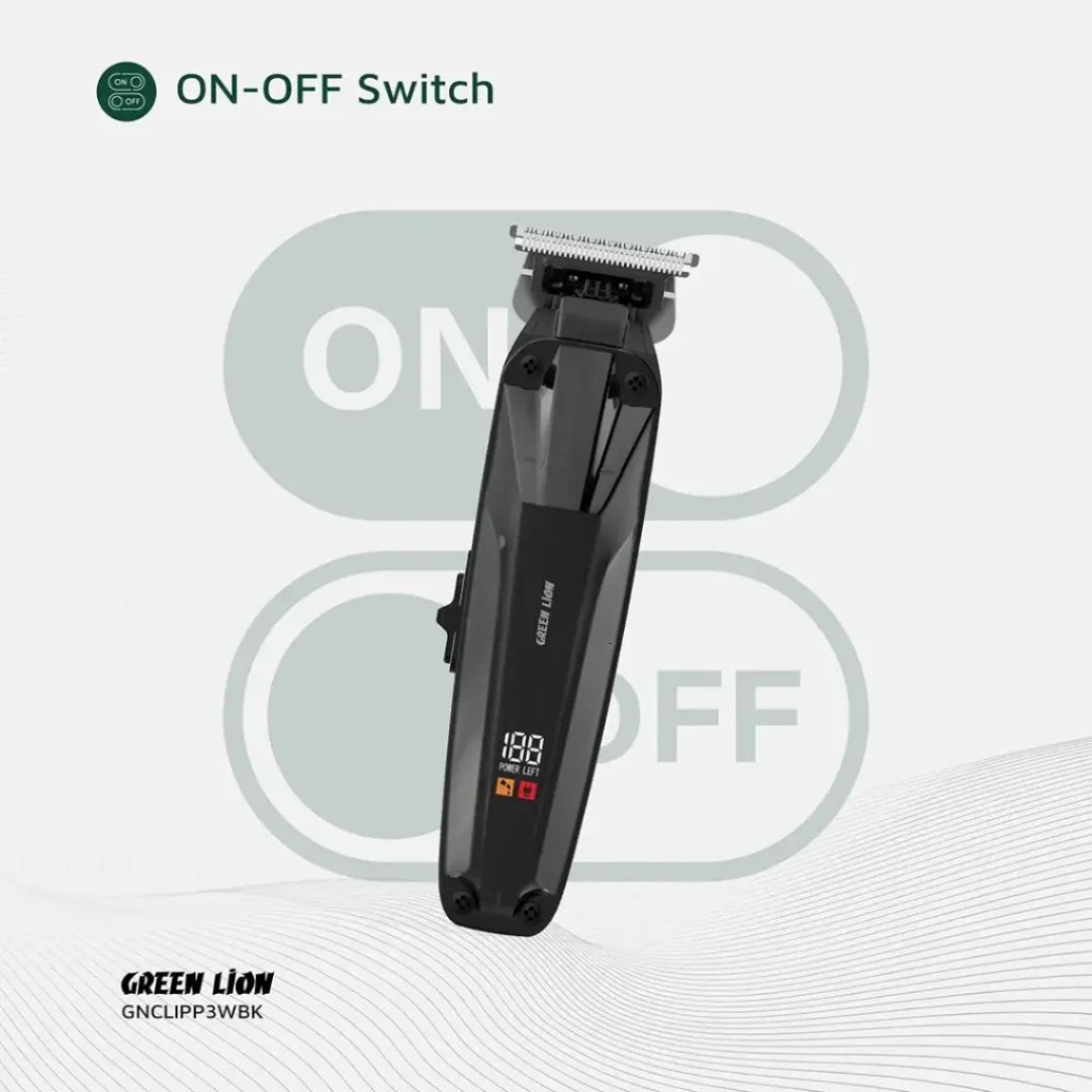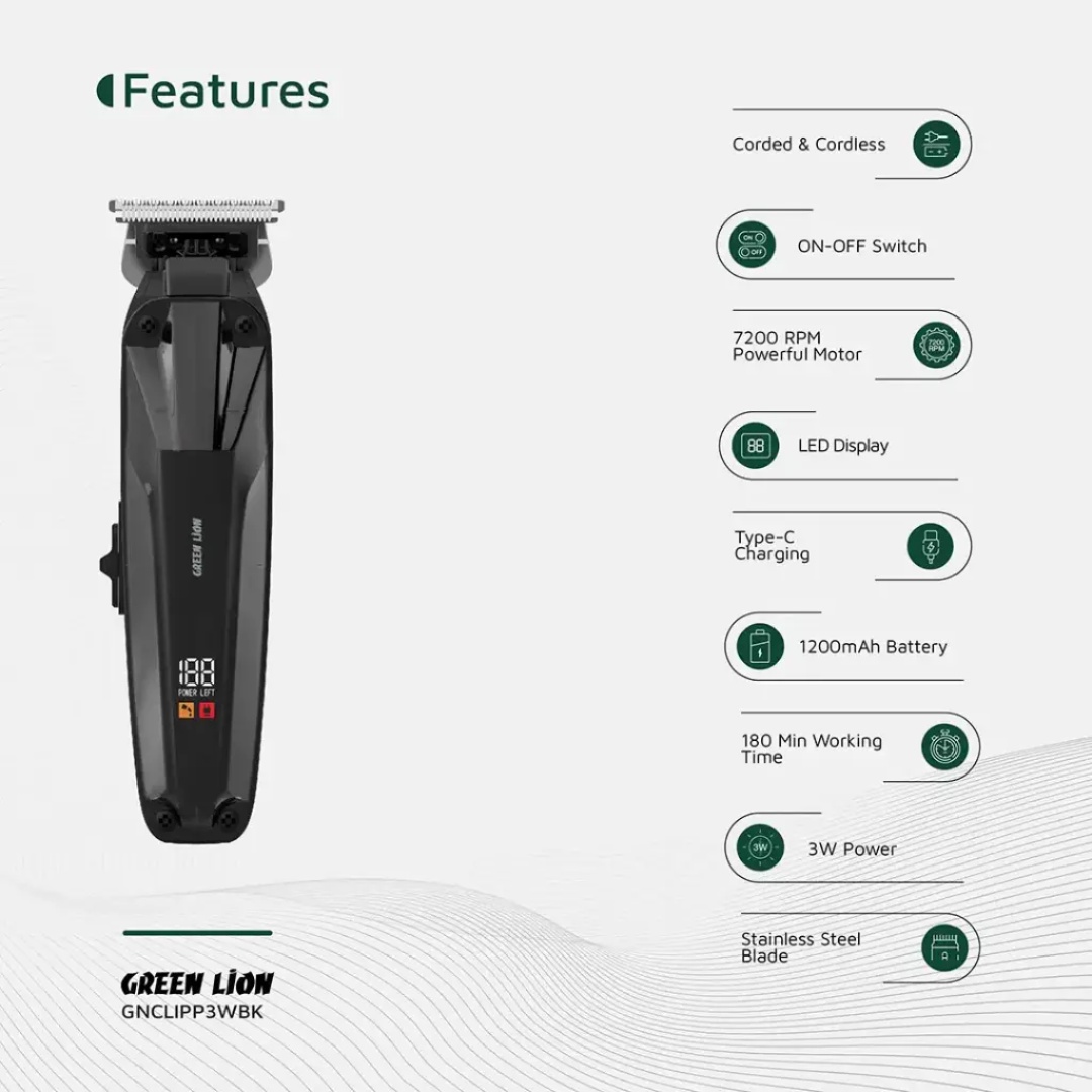 Green Lion Clip Master Professional Hair Clipper is professional-grade, long-lasting, and precision quality. This clipper has a high-performance FF-280PA motor of 7200 RPM and provides practical and smooth trimming. Stainless steel blades provide a clean and crisp cut, and adjustable comb sizes (1.5/3/4.5mm) provide different styling. It has a 1200mAh battery, offering 3 hours of uninterrupted use in a single 2.5-hour charge from its Type-C charging port. The LED screen provides a real-time battery level, ensuring smooth grooming sessions. Both corded and cordless, the Green Lion Clip Master is the epitome of convenience and ease of use. The ergonomic ABS + PC body gives a comfortable grip, and the on-off switch is simple to use. This powerful and long-lasting clipper is guaranteed to deliver an ideal grooming experience every time for personal or commercial use.