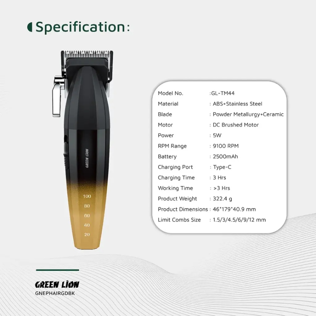 The Green Lion Edge Pro Hair Clipper-Gold Black stands up as a tool of great performance for grooming purposes and carries an air of precision plus convenience. The clipper holds a sturdy ABS plastic body with stainless steel materials for operations that are smooth and long-lasting. The DC brushed motor delivers powerful performance at 9100 RPM for razor-sharp, clean cuts. It owns an abundance of a 2500mAh giant battery capacity, allowing a runtime of over 3 hours with one full charge, suitable for various grooming sessions. Featuring Type-C charging, the clips give quick recharging and can be ready within 3 hours. The adjustable taper lever allows you to change the cutting lengths easily, and with 6 size guide combs (1.5/3/4.5/6/9/12 mm) at your disposal, you are set for any hair style adjustment. Equipped with a battery indicator and provided in an ergonomic form, it caters to comfortable use, having become the quintessential and versatile grooming tool.