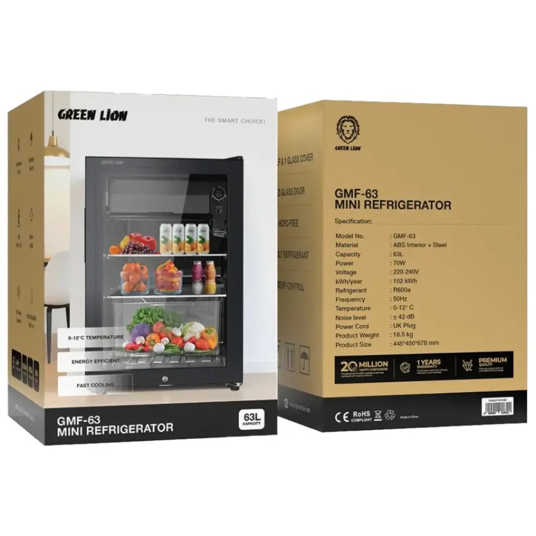 The Green Lion GMF-63 Mini Refrigerator 63L – Black is the perfect combination of small size and high performance; thus, the appliance is very suitable for a small kitchenette, office, dormitory, or personal and private area. Steel outer casing and ABS inner lining make sure that it is very reliable and easy to clean for a long time. It has a capacity of 63 liters, which is quite enough for drinks, snacks, and daily essentials. This mini fridge is powered by 70W of energy-saving cooling, and it uses the refrigerant R600a, which allows it to deliver fast and eco-friendly performance while consuming only 102kWh in a year. The 5-level temperature control provides cooling adjustment between 0°C and 12°C, which is great for maintaining the freshness of various items. The Green Lion GMF-63 operates quietly at ≤42dB, even though it is powerful, and that makes it a perfect choice for bedrooms or workspaces. This mini refrigerator with a UK plug, fast cooling technology, and sleek black design offers the combination of style, functionality, and energy efficiency all at once.