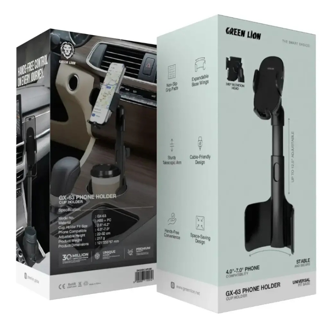 The Green Lion GX-63 Phone Holder Cup Holder is a new, adopted style hands-free device for your car. Its rotation of 360° gives you the ability to move the phone around for the best viewing angle with ease. The base wings that can be expanded assure a tight fit for the various sizes of the cups, while the universal compatibility of the phone includes devices with sizes ranging from 4.0″ to 7.0″. The pads with a no-slip grip are the ones that guarantee the position of everything, even on bumpy roads. The space-saving design fits perfectly to declutter your car and keep it organized. The force of magnetism works as the assurance that both your cup and phone are among the insecure hands, thus making this adjustable cup holder both functional and practical. The Green Lion GX-63 Phone Holder is the perfect car accessory for providing comfort and convenience while driving, working, or having a phone call.