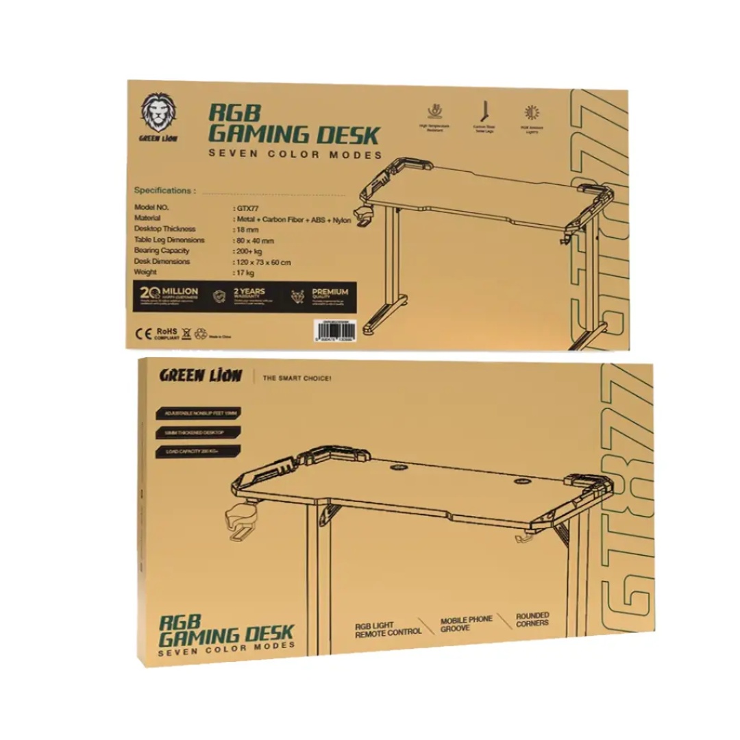 The Green Lion RGB Gaming Desk is a top-notch, high-performance professional gaming desk constructed from a combination of metal, carbon fiber, ABS, and nylon. It is a lifetime desk. The thickness of the desktop is 18mm, and the legs are constructed from carbon steel measuring 80×40 mm. The desk provides excellent stability and a highly impressive bearing capacity of over 200kg. The desk size (120×73×60 cm) provides ample space for multiple monitors and game setups. Include two customizable RGB ambient lights via remote control in your gaming setup. The desk features an anti-collision design, rounded edges, and a wear-resistant surface for safety and longevity. Practical features like a cup holder, mobile phone groove, and cleanable surface make it highly functional. Resistant to heat and built to endure, the Green Lion RGB Gaming Desk is the ideal choice for a tidy, modern gaming experience.