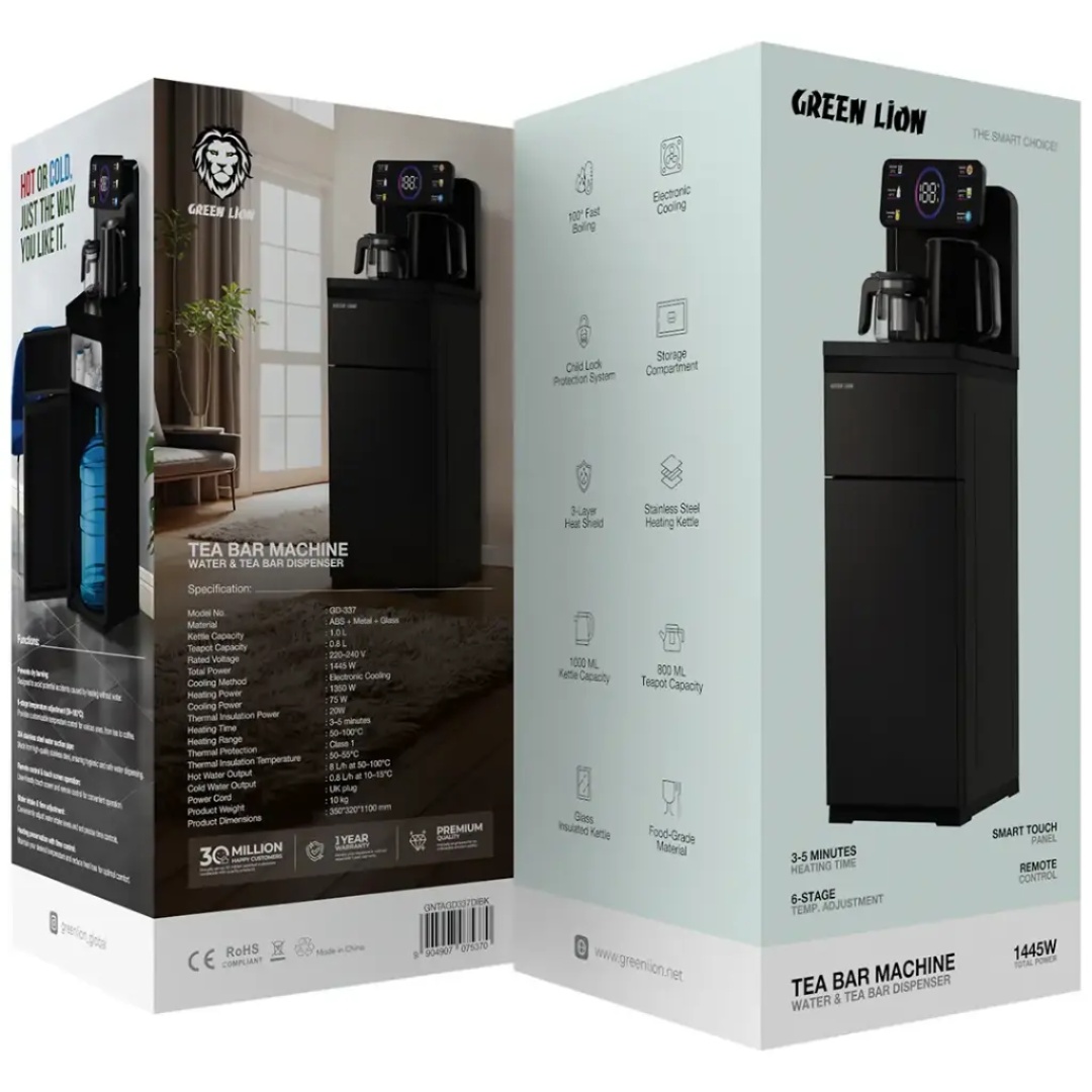 For those who are ardent tea and hot drink lovers, the Green Lion Tea Bar Machine Water and Tea Bar Dispenser has got everything covered, making it a perfect blend of efficiency, safety, and style. Its construction consists of high-quality ABS, metal, and glass, which makes it a versatile device that can be used with the inclusion of a 1.0L stainless steel kettle and a 0.8L glass teapot. Boiling at a fast rate of 100°C within just 3-5 minutes, the machine makes sure that you have your drinks ready almost instantly. The electronic cooling system, on the other hand, supplies chilled water at a temperature of 10-15°C, which is done hassle-free with the rate of 0.8L/h of cold water provided. The machine is designed with a smart touch panel and a remote control through which you can change the temperature settings from 50-100°C in 6 different ways. The manufacturer has taken care of possible dangers by including a child lock system, a 3-layer heat shield, and Class 1 thermal protection in the design to ensure completely safe operation. The Green Lion Tea Bar Machine, which is insulated to maintain 50-55°C, has a thermal output of 8L/h for hot water and also includes a spacious storage compartment. It is the result of combining modern technology, high-end materials, and user-friendly features that the Green Lion Tea Bar Machine has so far provided the best quality tea experience.