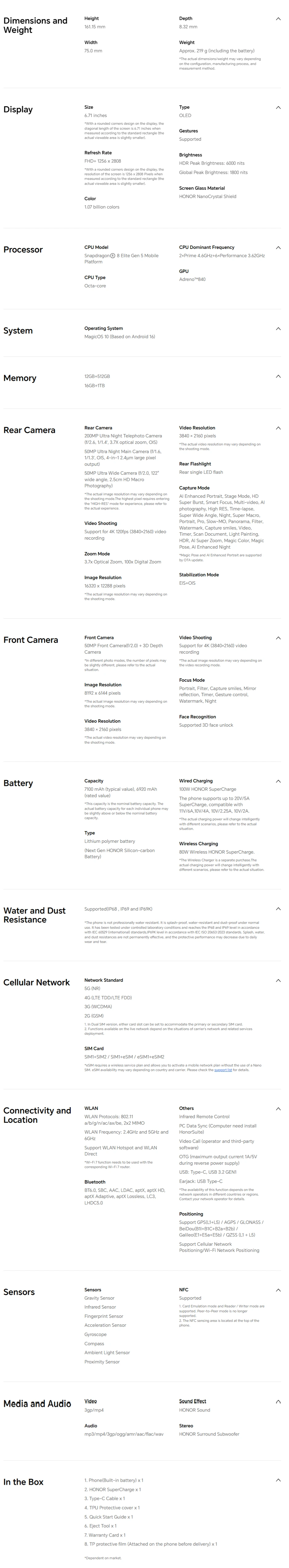 HONOR redefines mobile photography with a triple-camera system led by the revolutionary 200MP Ultra Night Telephoto Camera. This sensor, paired with a large f/1.6 aperture and OIS, delivers unparalleled detail and clarity at 3.7x optical zoom, with the capability for lossless hybrid zoom up to 100x digital. It is complemented by a 50MP Ultra Night Main Camera and a 50MP Ultra Wide camera, creating a versatile setup that excels in any light, from bright daylight to extreme low-light conditions. The front houses a sophisticated 50MP selfie camera and a 3D Depth Camera for secure face unlock and immersive portrait effects.