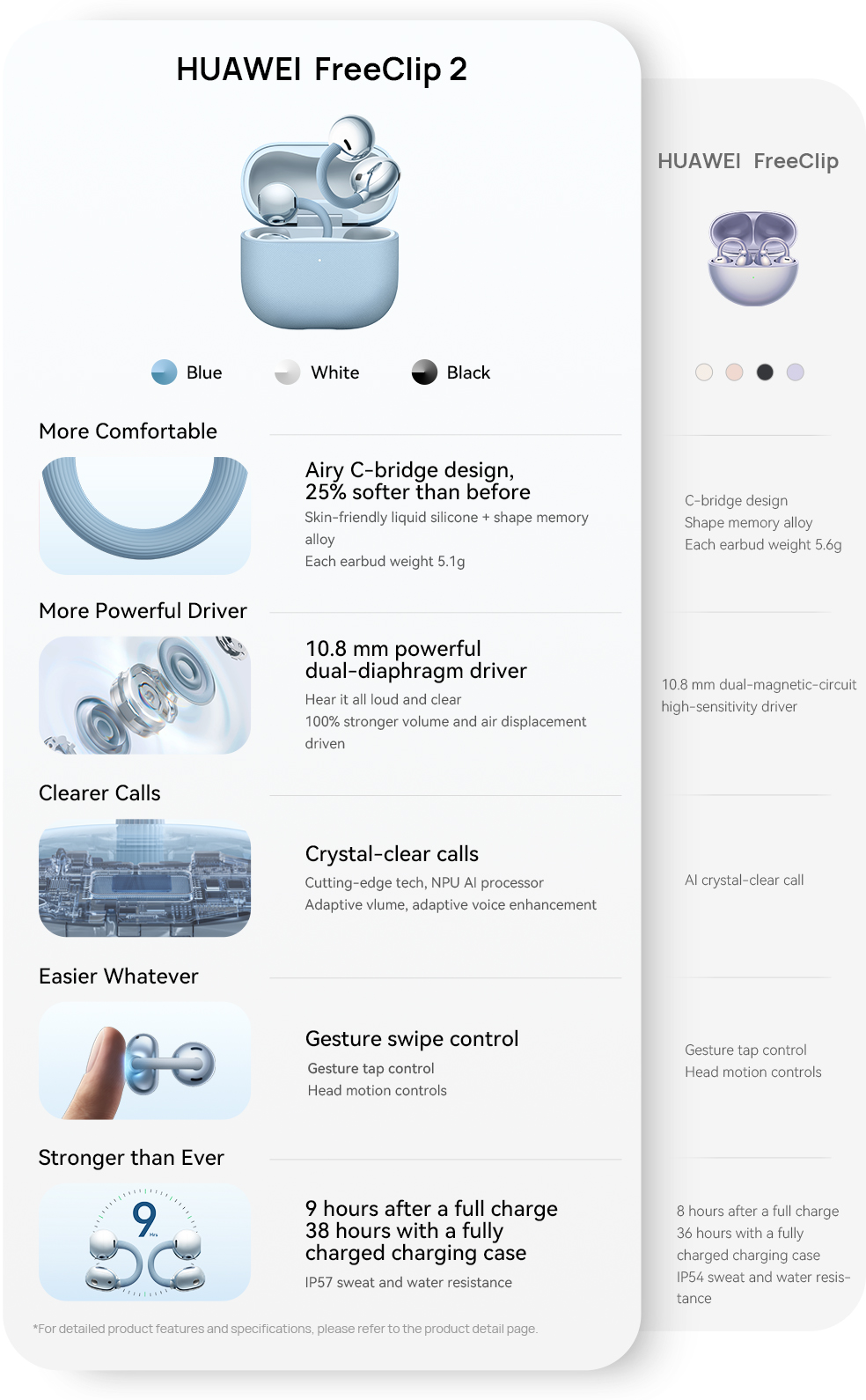 Experience audio without intrusion with the Huawei FreeClip 2, innovative open-ear earbuds designed for all-day comfort and situational awareness in Lebanon. Featuring the unique airy C-bridge design, these earbuds clip gently onto your ear without entering the ear canal, making them 25% softer than before for exceptional, pressure-free wear. Despite their open design, they deliver impressive sound quality through a 10.8 mm powerful dual-diaphragm driver, ensuring rich audio with clear highs and mids. Stay connected with crystal-clear calls thanks to advanced noise reduction algorithms. Enjoy up to 9 hours of playback on a single charge and a total of 38 hours with the charging case, alongside intuitive gesture swipe control for effortless operation. The Huawei FreeClip 2 is the perfect choice for Lebanese users who prioritize comfort, awareness, and convenience.