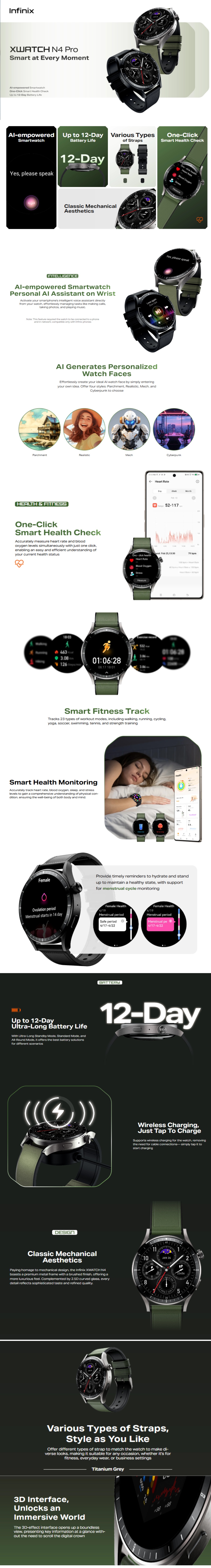 Say goodbye to daily charging anxiety. The Infinix XWATCH N4 Pro is engineered for endurance, delivering up to 12 days of battery life on a single charge. This long-lasting performance means you can wear it continuously for sleep tracking, health monitoring, and daily notifications without constantly searching for a charger. When you do need to power up, the convenient wireless charging feature makes replenishing the battery hassle-free.
