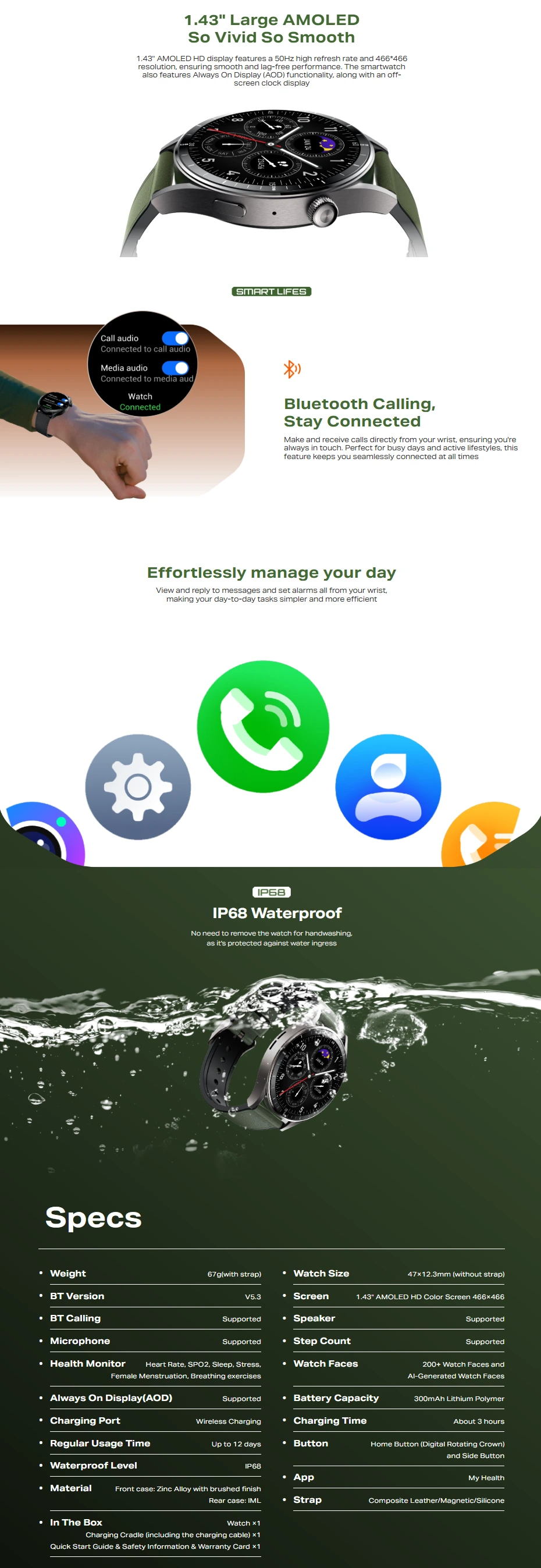 - Classic Mechanical Aesthetics: A stylish design with a 1.43-inch AMOLED HD color screen (466 × 466 resolution) and Always-On Display (AOD) support.