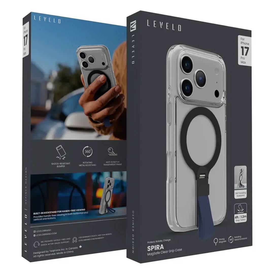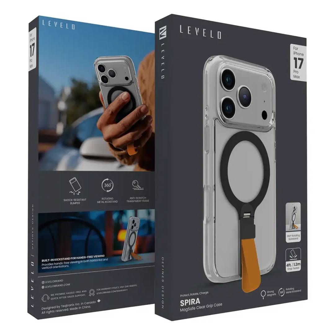 The Levelo Spira Grip Case for iPhone 17 Pro Max is perfectly balanced in terms of protection, functionality, and style. Equipped with strong magnets, these cases function seamlessly via MagSafe for easy attachment of chargers and accessories. Its metal kickstand rotates 360 degrees for hands-free viewing from any angle, ideal for watching videos and video calls. With a shock-absorbing bumper, drop-tested from 4 ft or 1.2 m, it will reliably protect against daily mishaps. The anti-scratch clear bumper keeps the visibility intact of your iPhone without it getting scratched or worn out. So whether you desire outright protection or some secondary convenience from the kickstand, the Levelo Spira Grip has got your back. With its rugged design and useful features, it is a must for anybody who wants to keep their iPhone 17 Pro/Pro Max safe, stylish, and “anytime-ready.”