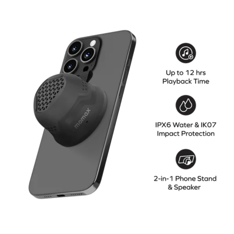 The Momax 1-Vibe Go Outdoor revolutionizes speaker placement with its magnetic attachment design . This innovative feature allows the speaker to easily attach to any metal surface or magnetically compatible phone . Whether you’re in the kitchen, at the office, or outdoors , you can enjoy music conveniently without the need for stands or accessories. The versatile mounting capabilities mean you can listen in a variety of settings—stick it to your fridge, bike frame, gym equipment, or directly to your MagSafe-compatible iPhone. This design requires no additional stand or accessories to function , simplifying your setup wherever you go.