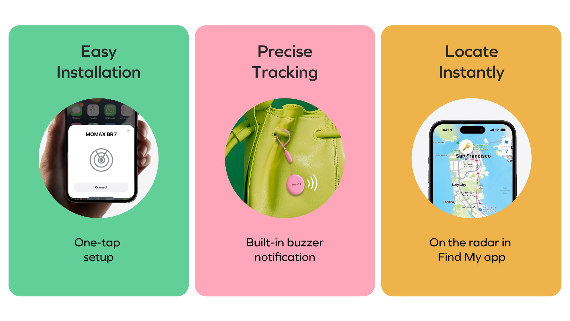 With the help of Apple Find My Network, the search range of MOMAX Key Locator is virtually unlimited. And it’s even more secure, no information is stored during use. Pre-installed Find My APP provides all functions for free, no need to install APP again