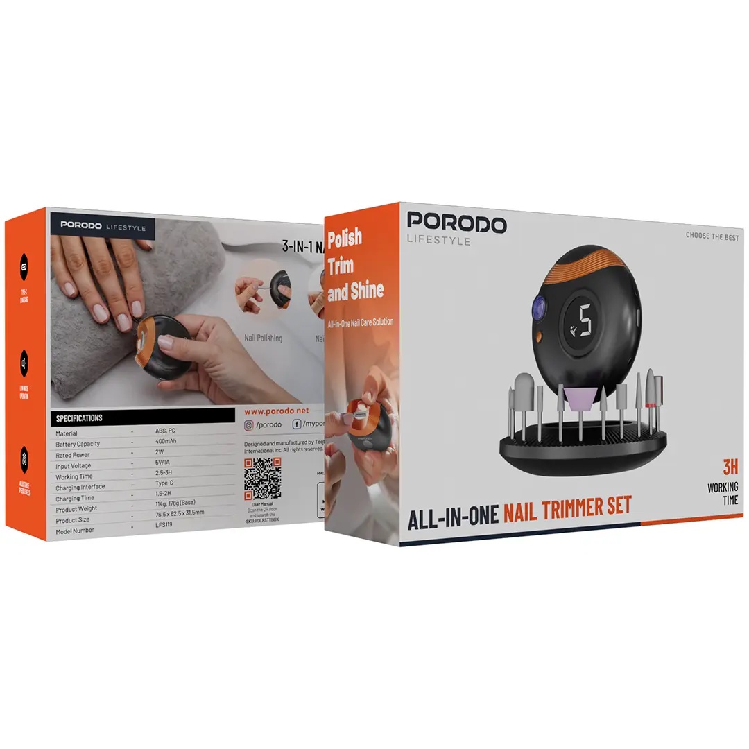 The Porodo Lifestyle All-In-One Nail Trimmer Set is a stylish, high-performance nail grooming gadget engineered with precision and convenience in mind. Toughened by quality ABS and PC materials, it makes for durability. Operated on a 400mAh battery, this tool can go up to 2.5-3 continuous hours with a single charge of 1.5-2 hours from its Type-C charging port, hence highly efficient. It works on a rated power of 2W and an input voltage of 5V/1A while maintaining consistent performance. The variable speed adjustable trimmer features a distinct nail trim for different conditions and thicknesses. Owing to the low noise operation, it does not sound much and gives comfortable grooming for adults and kids alike. Compact, portable, and convenient to use, the Porodo Nail Trimmer Set is the best all-in-one solution for well-groomed nails.
