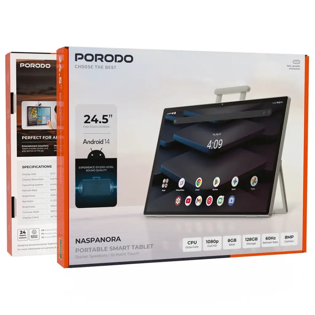 The Porodo Naspanora Portable Smart Tablet with Stereo Speakers & 10-Point Touch – White is a portable powerhouse and versatile device for its users. The 24.5-inch Full HD touch screen delivers astonishing viewing quality from all its angles, whether you are watching movies, playing games, or taking part in video calls with the 8MP camera. The Octa-Core CPU with 8GB RAM and 128GB storage powers this tablet that guarantees seamless multitasking and enough space for your apps & files. The stand that can be adjusted provides different angles of viewing, and the carrying handle of the tablet makes it very portable. The Naspanora tablet is a perfect partner for productivity plus fun, no matter if you are working, learning, or creating. It has Wi-Fi 6, Bluetooth V5.2, and a powerful battery that lasts really long, so it’s just perfect for traveling, studying, and having fun all day long.
