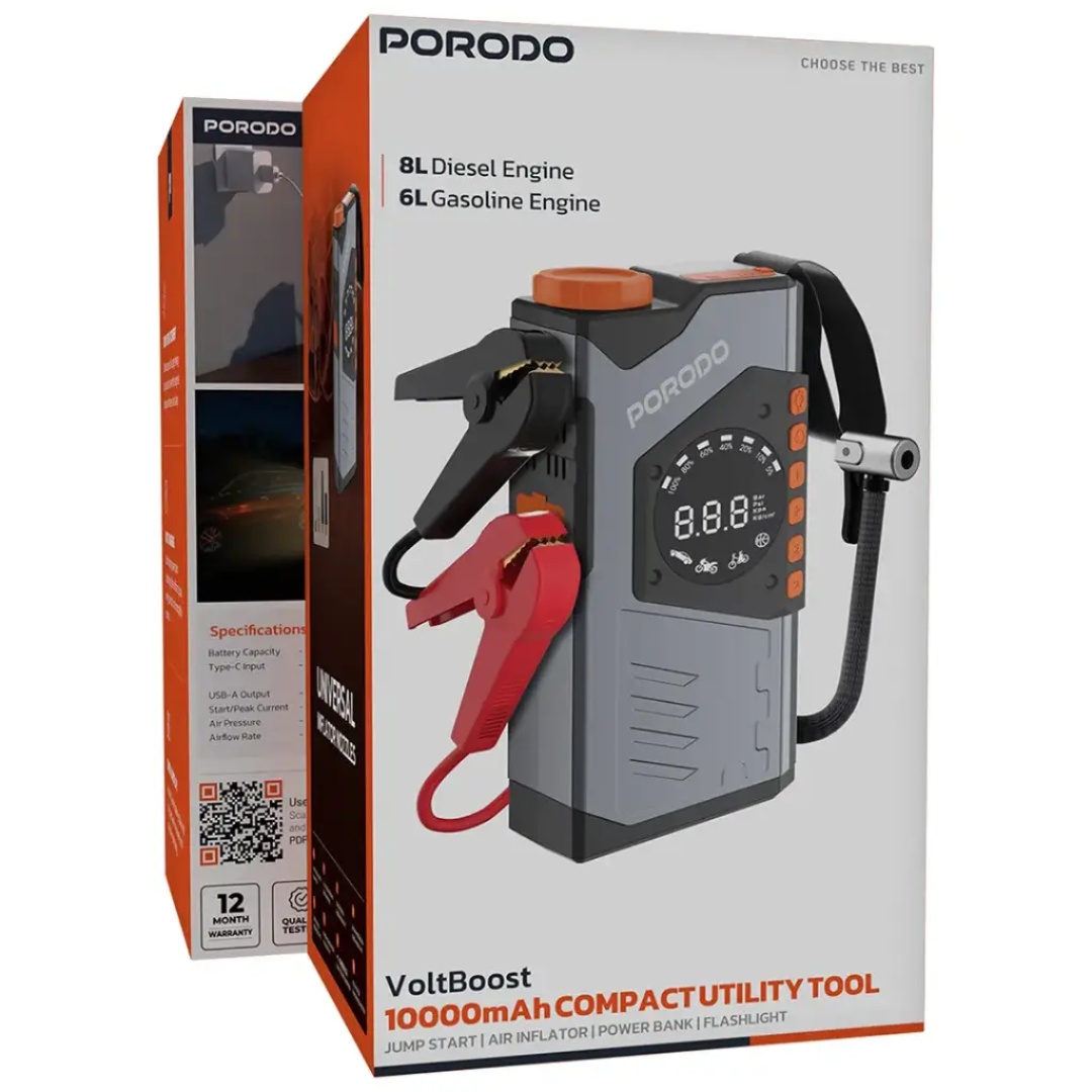 The Porodo VoltBoost 10000mAh Compact Utility Tool in Grey is a multi-purpose and powerful gadget meant for versatile use. With a battery capacity of 10000mAh, the gadget assures performance in backing up vehicles, sealing tires, and powering your devices. The tool comes with the protection of the peak current of 1200A and can jump-start vehicles with engines up to 6L gasoline or 8L diesel. The pump’s built-in air compressor offers up to 150PSI maximum pressure and an airflow rate of 23 L/min, thus making it suitable for inflating tires. A USB-A output for charging delivers 10W of power, while a Type-C input fast-charges at up to 18W. Real-time information is provided by a digital display, and the flashlight is great for emergency visibility. The compact design of the device allows the end-user to carry it anywhere, traveling, along with roadside help, and for daily use with an operating range between -20~60˚C and very fast charging of only 2 hours.