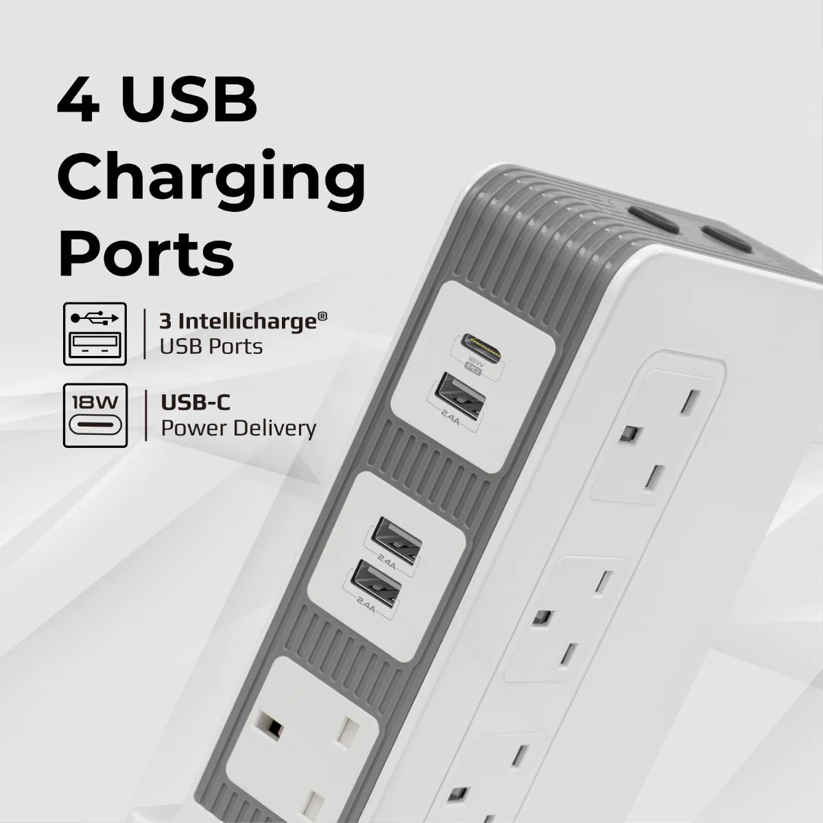 In addition PowerTower features 4 USB charging ports and an 18W USB-C charging port leaving the AC connections free.