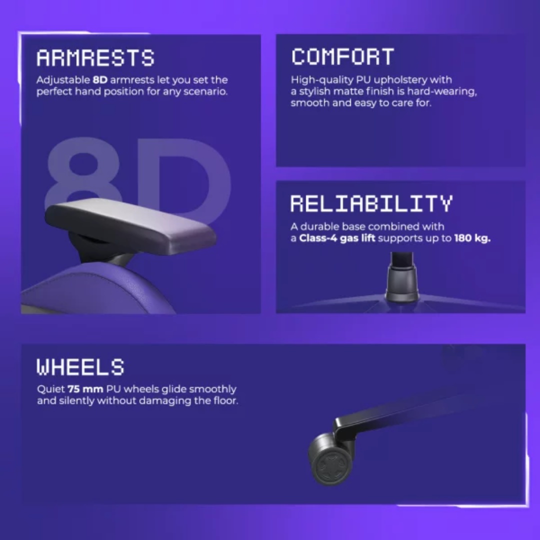 The chair features 8D armrests with advanced customisation options and dynamic adaptation. The backrest reclines up to 160°, while the frog mechanism allows the seat to tilt up to 17°, ensuring a secure and comfortable seating position.