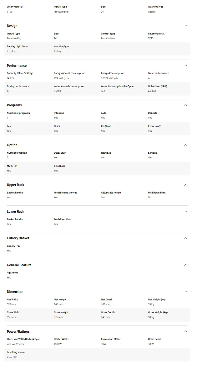 Special Features: Auto Door Open, Hygienic Rinsing, Half Load, 60-Minute Cycle
