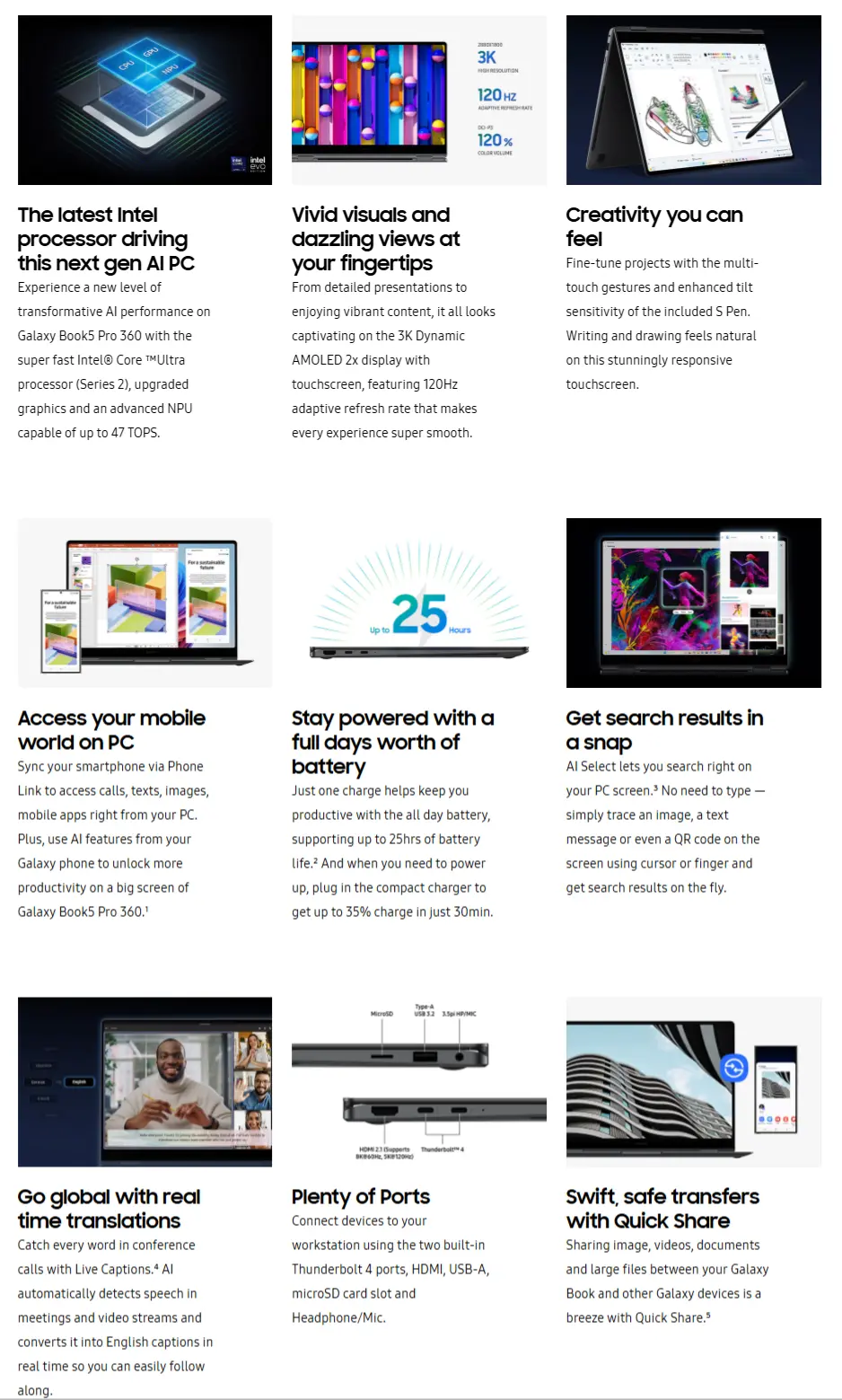 The Samsung Galaxy Book 5 Pro 360 connects effortlessly with your mobile world. Through Phone Link, you can access your mobile world on PC—sync calls, texts, images, and even mobile apps directly from your Galaxy phone . Plus, leverage AI features from your Galaxy phone to unlock more productivity on the big screen of your laptop . Quick Share makes transferring images, videos, documents, and large files between your Galaxy Book and other Galaxy devices incredibly fast and secure .