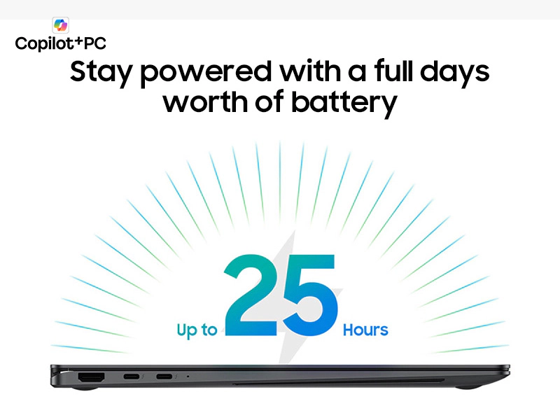 Stay productive wherever you go with the exceptional battery life of the Samsung Galaxy Book 5 Pro 360. The powerful 76Wh battery supports up to 25 hours of usage on a single charge—enough for a full day of work, creativity, and entertainment . When you need to power up, the compact charger delivers up to 35% charge in just 30 minutes, getting you back to work quickly .