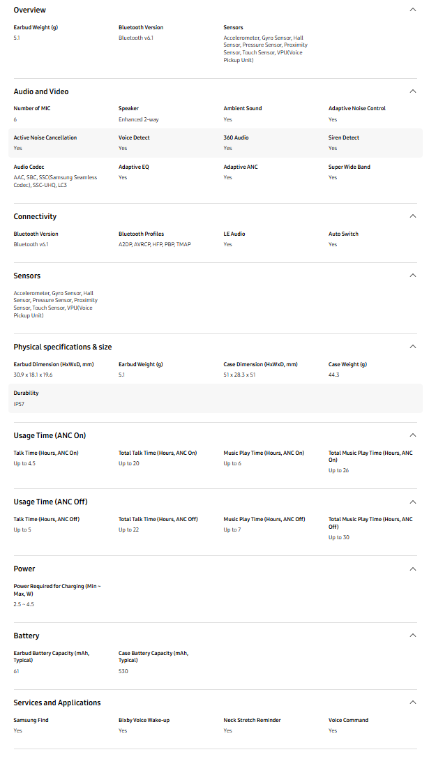 Connectivity: Bluetooth v6.1 , Auto Switch , LE Audio, Samsung Find