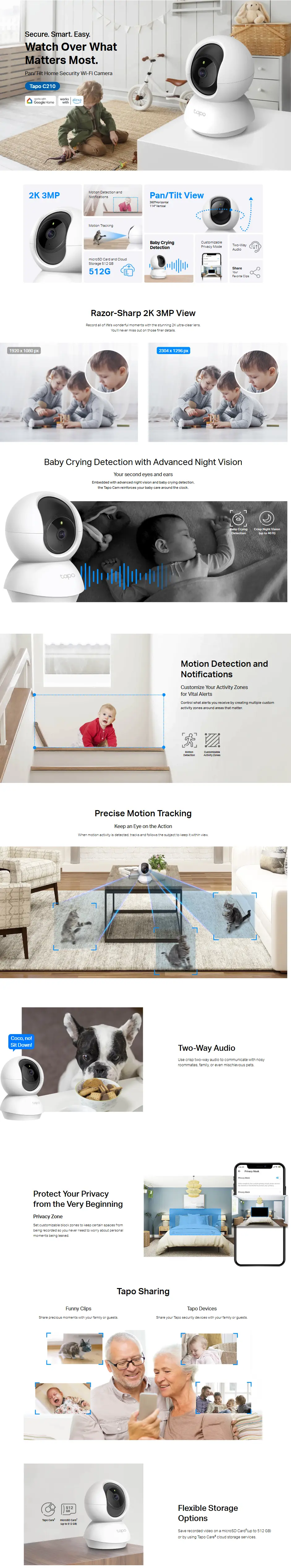 Store your high-quality footage reliably and privately using a microSD card (up to 512GB) for local storage, offering a secure and cost-effective alternative to cloud subscriptions (card sold separately). The camera supports easy setup and management via the intuitive Tapo app. For added convenience, it is compatible with Google Assistant and Amazon Alexa, enabling hands-free voice control to view live feeds on compatible smart displays and speakers.