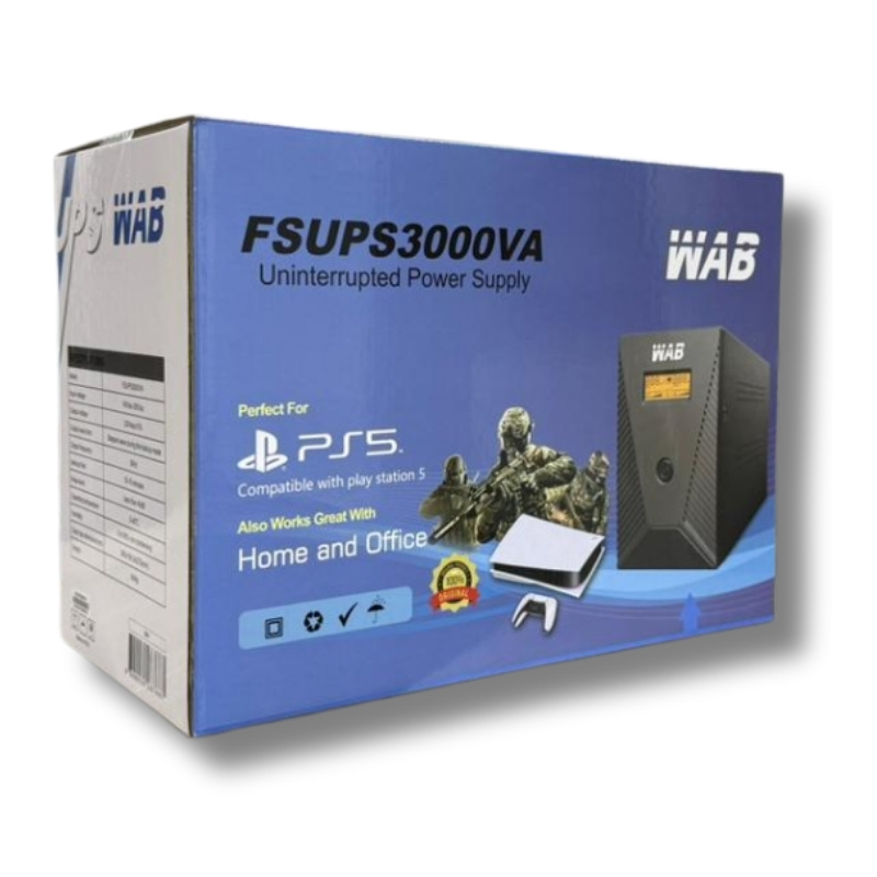 Safeguard your PlayStation 5 and other valuable electronics with the WAB Power Supply UPS 3000VA FSUPS3000VA , a robust uninterruptible power supply specifically designed to provide reliable backup power and voltage regulation. Now available across Lebanon, this powerful UPS ensures your gaming sessions, work, and critical devices remain operational during power fluctuations and outages. With its wide stabilization range and generous backup runtime , the WAB FSUPS3000VA is the perfect protection solution for your PS5, home entertainment system, or home office equipment.